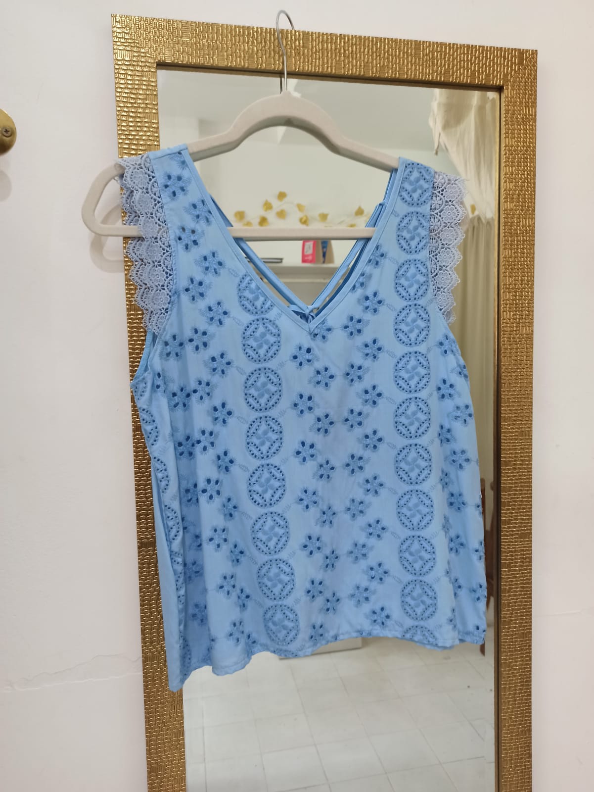Blusa Celeste con Puntilla perteneciente a la categoría blusas. Diseño femenino, cómodo y adaptable para uso diario o eventos especiales. Confeccionado con materiales seleccionados para brindar buena caída y durabilidad. Perfecto para combinar con otras prendas de la colección.